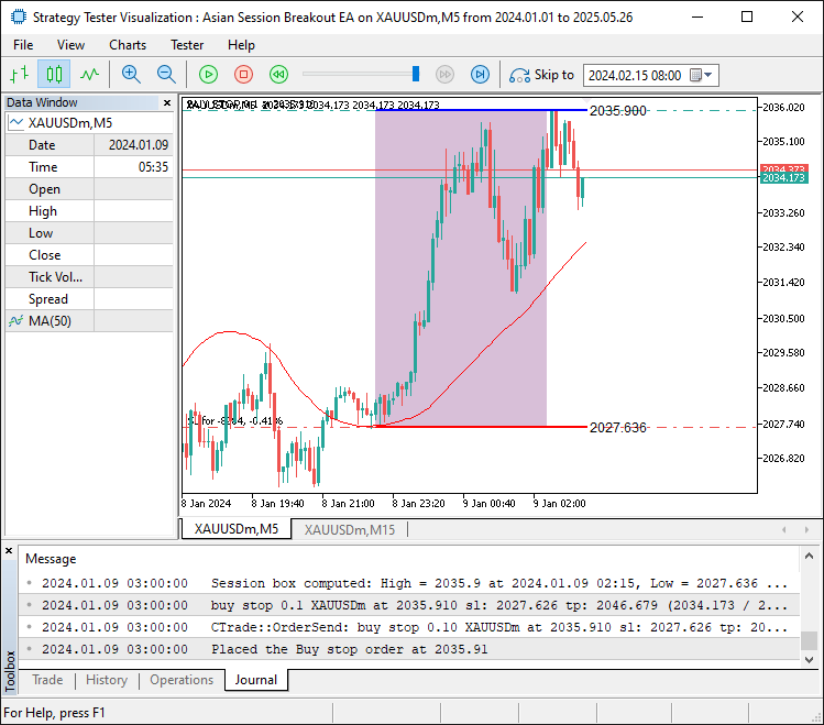 For beginners, a breakout strategy means we wait for the price to burst out of a range. The Asian session (23:00 to 03:00) often has low movement, so we mark the highest and lowest prices in this time on a 15-minute chart ("PERIOD_M15"). If the price breaks above the high and is above the "50-period SMA", we set a buy stop order; if below the low and under the "SMA", a sell stop order. We offset entries by "BreakoutOffsetPoints" (10 points) for confirmation, set stop-losses at the opposite range, and take-profits at 1.3x the risk ("risktoreward"). Trades close by 13:00, and an optional trailing stop can follow the price. Here is a visualization.