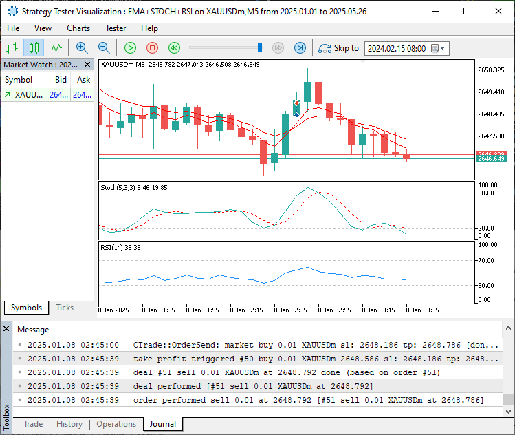 3. Drop the EA on your chart, enable AutoTrading, and watch it open buy/sell trades based on EMA, Stochastic, and RSI signals.