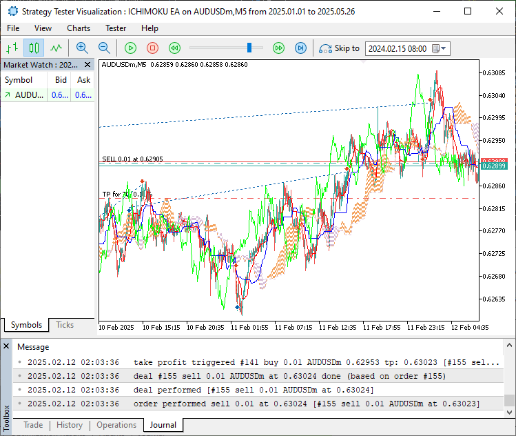 For example, on EURUSD H1, if Tenkan-sen crosses Kijun-sen at 1.2000, with the ask at 1.2008 above the cloud (Senkou Span A at 1.1995, B at 1.1990), the EA buys at 1.2008, setting a take profit at 1.2078. A sell at 1.1995 (bid) below the cloud (1.2000, 1.2005) targets 1.1925. This is like directing traffic to seize a prime trading route, capitalizing on the market’s momentum.