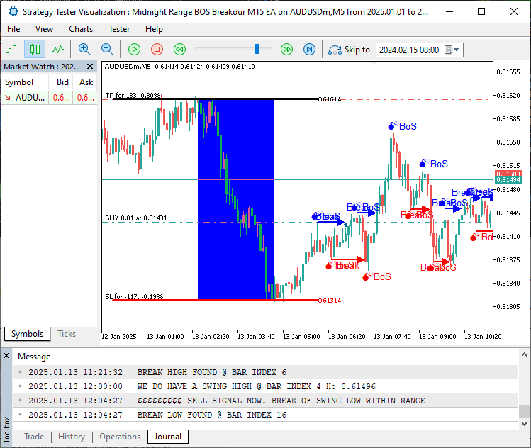Picture yourself as a skilled navigator, charting market movements with pinpoint accuracy. The Midnight BOS Breakout strategy targets breakouts from the price range formed between midnight and 6 AM, a period often reflecting early market sentiment. By 6 AM, the strategy identifies the highest and lowest prices to establish a range, visually marked for clarity. Trades are triggered when the price breaks this range between 6 AM and 11 AM, but only if confirmed by a Break of Structure (BOS) on a shorter timeframe, such as a 5-minute chart. A BOS occurs when the price surpasses a recent swing high (for buys) or swing low (for sells) within the range, signaling strong momentum. Small trades are opened with stop losses at the range’s opposite boundary and take profits at the range’s high/low, ensuring a controlled risk-reward ratio. This approach suits traders seeking to capitalize on early market moves in trending conditions, with visual cues enhancing decision-making.