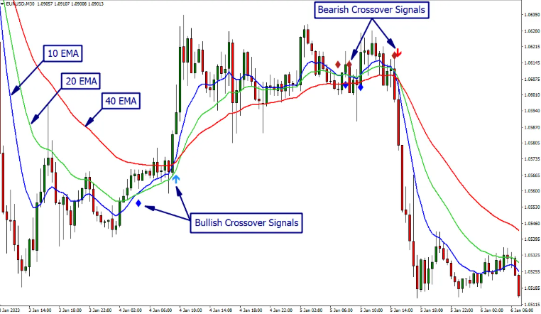 When these MAs stack up in a specific order, it’s like the market’s waving a neon sign saying, “Trend alert!” A buy signal pops when the fast MA is above the medium, and both are above the slow. A sell signal hits when the fast is below the medium, and both are below the slow. Plus, we wait for the medium and slow MAs to cross for confirmation—like a high-five to seal the deal. See below.