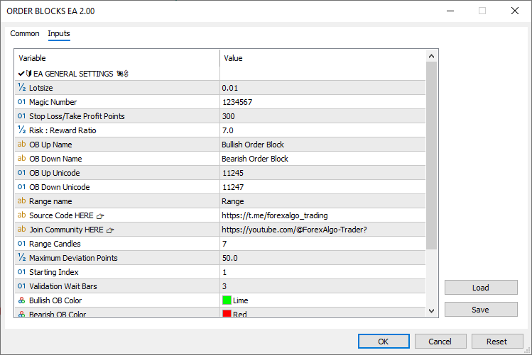 2. Visualize Order Blocks: We’ll configure the EA to draw rectangles on the chart to mark order block zones, using distinct colors for bullish (lime), bearish (red), and invalid (blue) blocks. This helps us visually confirm the EA’s logic in real-time.
