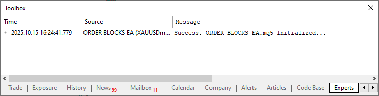 Finally, we return INIT_SUCCEEDED to tell MetaTrader 5 that our setup went smoothly. It’s like the EA winking at the platform, saying, “I’m good to go, let’s make some pips!” This simple initialization ensures our trading object is ready and our debug logging is set, paving the way for the real action in detecting and trading order blocks. This is what we get, of course if you have enabled statements' printing.