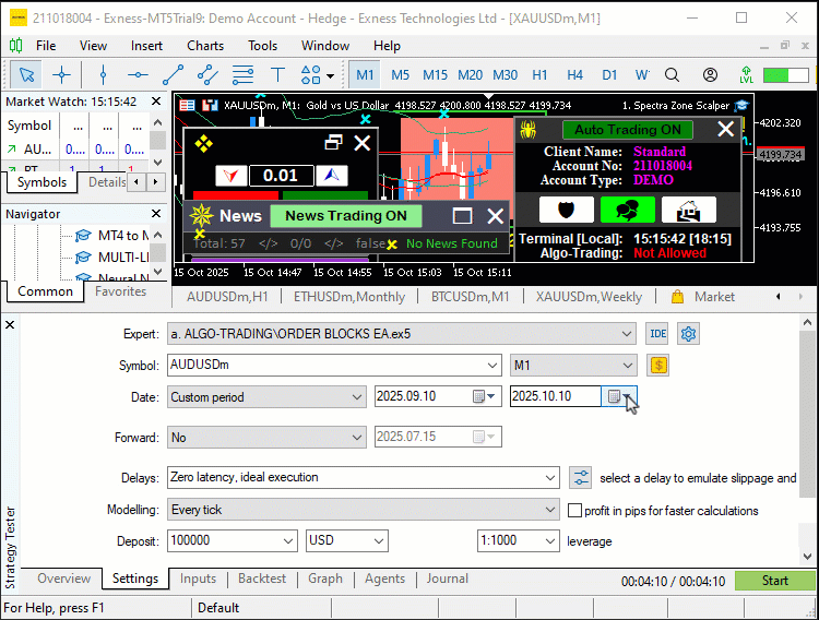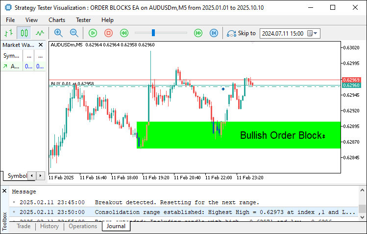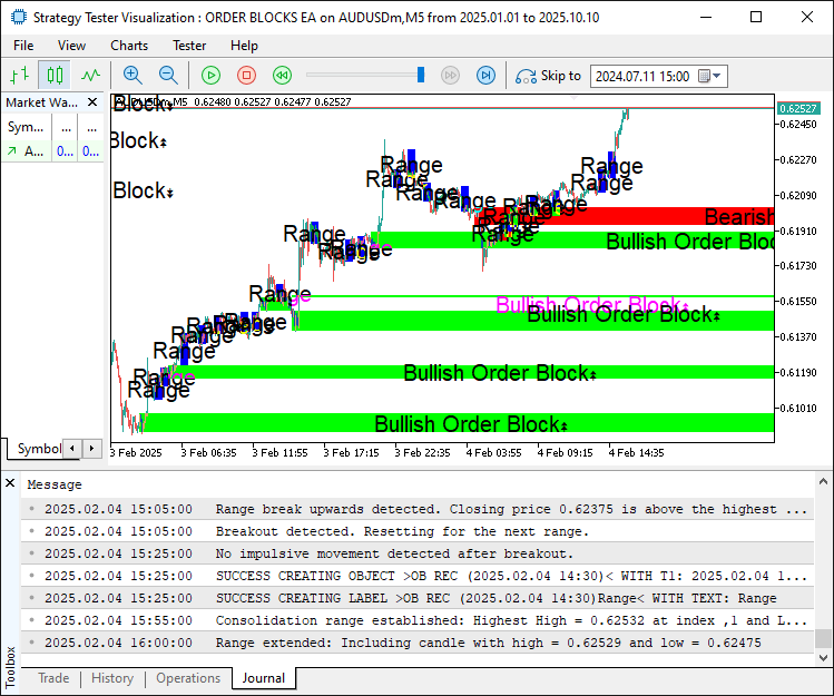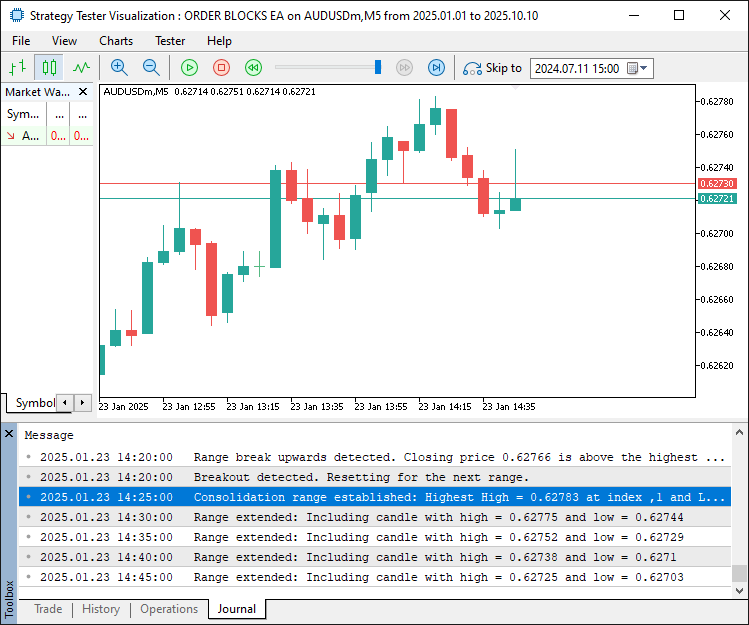 We’ve crossed the finish line, having built a solid MQL5 Expert Advisor that automates order block trading with clarity and precision. With functions like "IsConsolidationEqualHighsAndLows" to detect consolidation ranges, "CreateRec" to paint order blocks on the chart, and "obj_Trade" to execute trades, our EA systematically targets institutional price zones. Testing shows it identifies bullish and bearish order blocks, manages trades with strict risk controls, and cuts down manual effort while keeping our trading steady. For traders at any level, this EA offers a structured way to tap into smart money movements. As we wrap up, this EA stands as a strong foundation for automated forex trading, ready for you to take it further with your own tweaks and strategies. If you prefer a YouTube video tutorial, we gat you buddy!