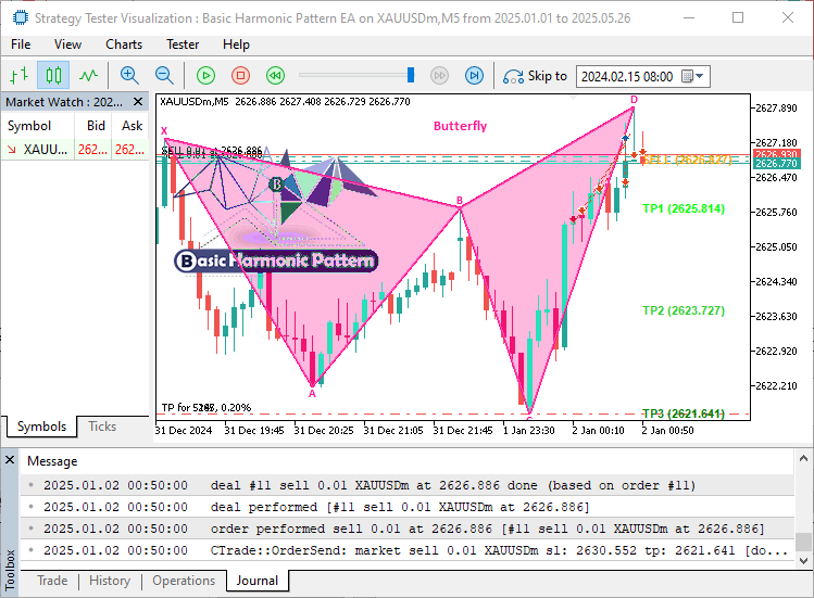The Harmonic Pattern EA leverages a custom indicator to detect harmonic patterns—geometric price formations based on Fibonacci ratios that signal potential reversals. Key patterns include Gartley, Butterfly, Crab, and Bat, each with specific Fibonacci levels (e.g., 61.8%, 78.6%) forming “M” (bearish) or “W” (bullish) shapes. The EA: