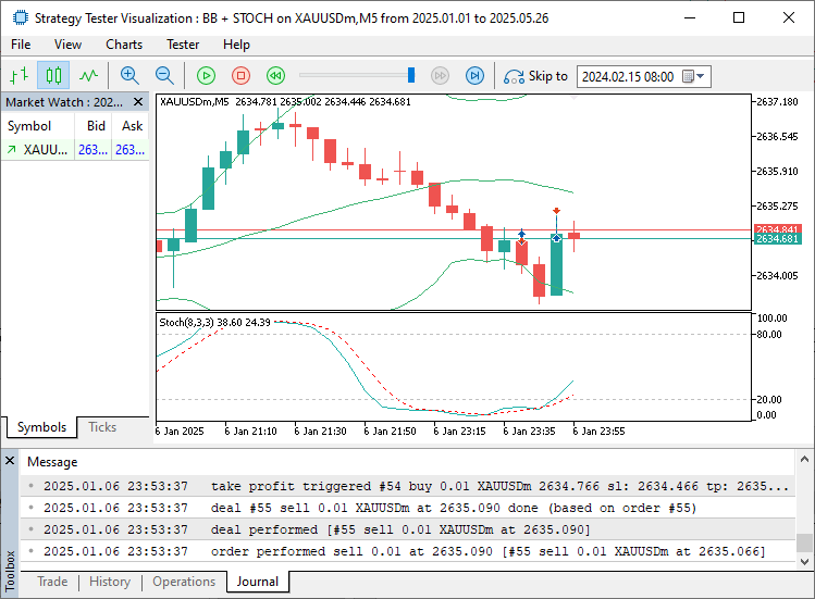 The EA buys when the price dips below the Lower Band and the Stochastic crosses above 20, confirming oversold conditions. It sells when the price rises above the Upper Band and the Stochastic crosses below 80, signaling overbought conditions. Trades use a 0.01-lot size with 300-pip stop loss and take profit, executed only when no positions are open and on new candles. It’s like catching the swing at its extremes with a safety net. See below.