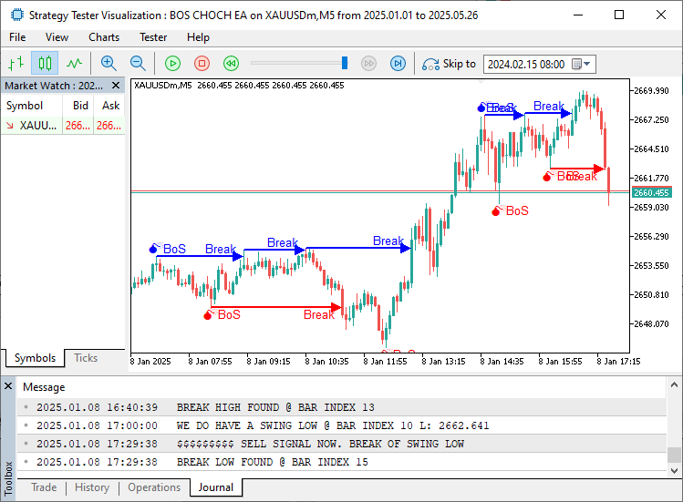 BOS and CHOCH patterns reflect shifts in market structure, driven by institutional order flow. Breaking a swing high/low signals strong momentum, while the EA’s swing detection ensures only significant levels trigger trades. Visual markers simplify decision-making, letting you focus on high-probability breakouts in trending markets.