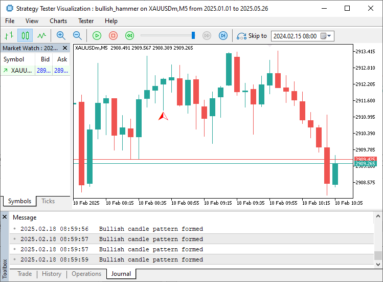 • "OnTick()": The EA’s hammer strike, running on every price tick. It calls "getHammer()" with parameters 0.1 (short body ratio) and 0.8 (long wick ratio), directing the craft toward pattern detection, like swinging a hammer at molten metal.