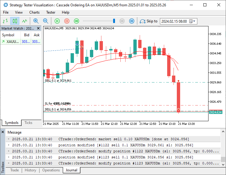 A buy signal triggers when the Fast EMA crosses above the Slow EMA, signaling bullish momentum; a sell signal fires when it crosses below, indicating bearish momentum. Initial trades (0.1 lots) open with a 300-pip stop loss and take profit. When price hits the take-profit, the EA opens a new trade, shifts the take-profit 300 pips further, and adjusts all open positions’ stop losses to 100 pips from the current price, creating a cascading effect. Trades execute only on new candles with no open positions, ensuring discipline. It’s like launching a raft at a river’s bend and adding more as the current strengthens. See below.