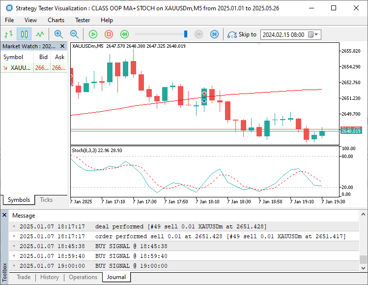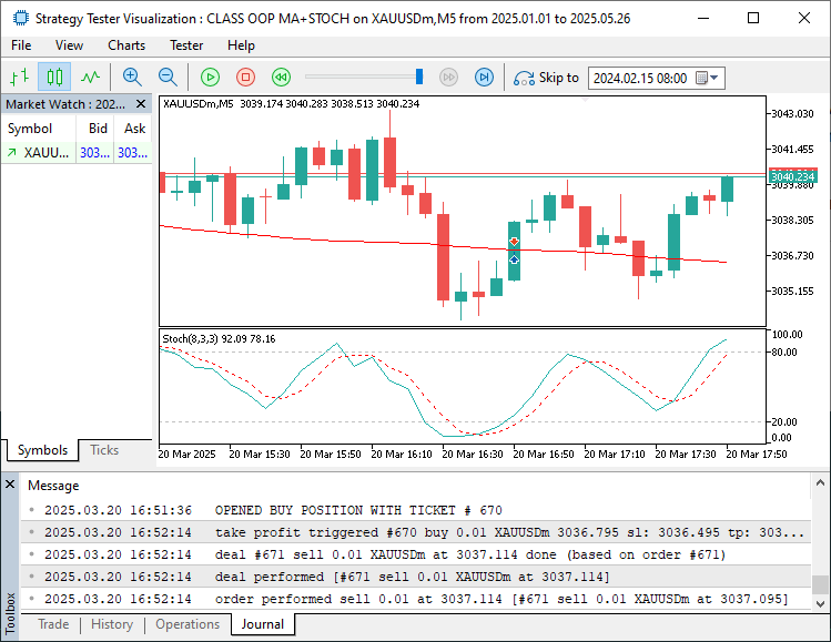 A buy signal triggers when Stochastic crosses above 20 from below and the candle’s low is below the MA, confirming a bullish reversal in a bearish context. A sell signal fires when Stochastic crosses below 80 from above and the candle’s high is above the MA, confirming a bearish reversal in a bullish context. Trades use a 0.01-lot size with 300-pip stop loss and take profit, executed on new candles with alternating buy/sell logic to prevent consecutive same-direction trades. It’s like guiding a ship into port when the tide turns, ensuring a steady docking. See below.