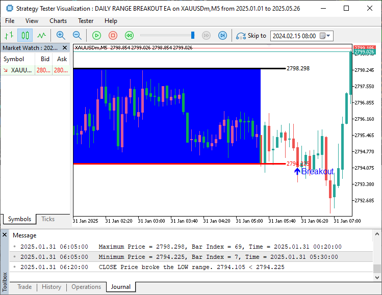 • Visualization: Draws a blue rectangle for the range, black upper line, red lower line, and arrows for breakouts.