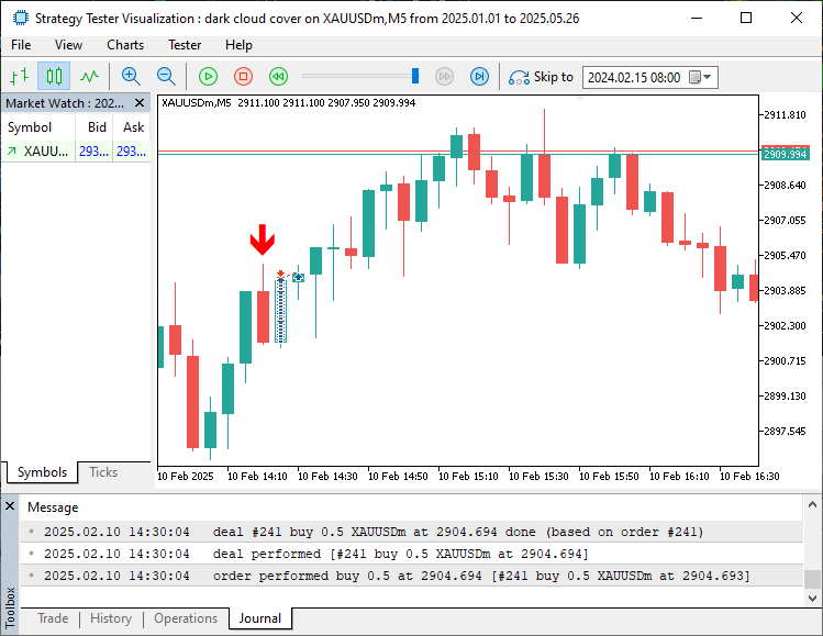 In "OnTick()", we call "getDarkCloudCover()". If it returns -1 and no positions are open ("PositionsTotal()"), we grab the bid price with "SymbolInfoDouble()", set a 300-pip stop loss ("sl") and take profit ("tp"), and execute a sell with "openPositions.Sell()" using 0.5 lots, like selling EURUSD at 1.2000 with a stop at 1.2300 and target at 1.1700. The position limit ensures one trade at a time, like chasing one storm without overloading.