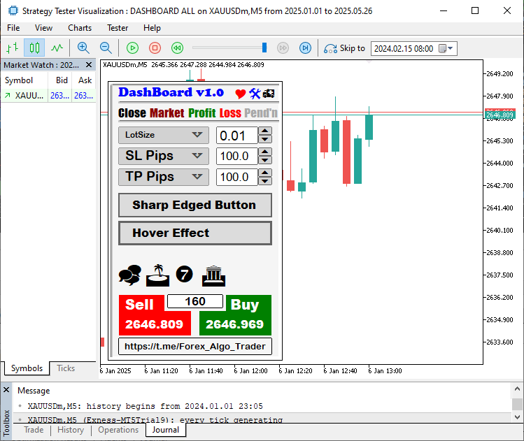 • Market Orders: Buttons for instant “Buy” or “Sell” trades with customizable lot sizes, stop losses, and take profits.