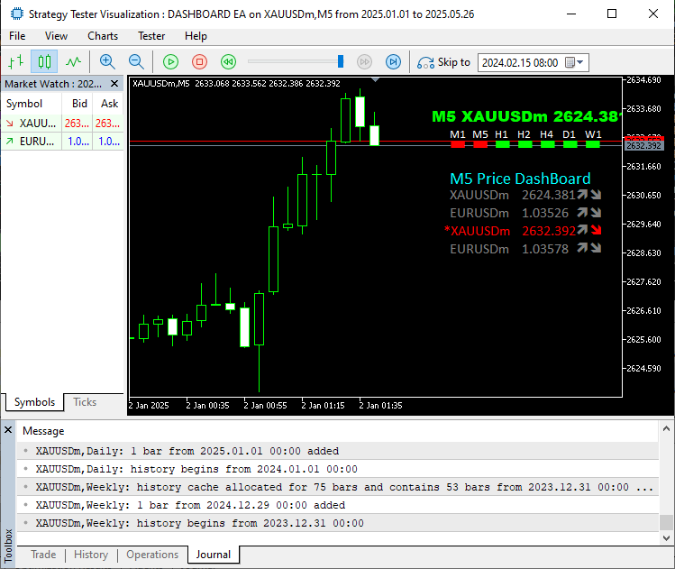 • Symbol Monitoring: Displays bid prices for all selected symbols (e.g., EURUSD, GBPUSD), with up/down arrows and color-coded names/prices (green/blue for bullish, red for bearish, gray for neutral) based on price changes.